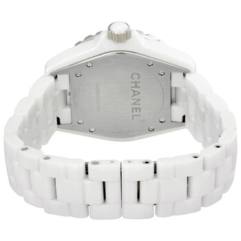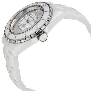 White ceramic case with a white ceramic bracelet. Uni-directional rotating stainless steel bezel with a white ceramic top ring. Mirrored dial with white lacquered center with luminous silver-tone hands and Arabic numeral hour markers. Minute markers around the outer rim. Dial Type: Analog. Luminescent hands and markers. Automatic movement with a 42-hour power reserve. Scratch resistant sapphire crystal. Screw down crown. Solid case back. Round case shape. Case size: 38 mm. Case thickness: 11 mm. Band width: 22 mm. Fold over clasp. Water resistant at 200 meters / 660 feet. Functions: hour, minute, second. Additional Info: limited edition of 1200 pieces. Luxury watch style. Watch label: Swiss Made. Chanel J12 Mirror Automatic Ladies Watch H4862.
