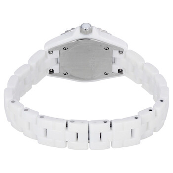 White ceramic case with a white ceramic bracelet. Uni-directional rotating silver-tone bezel with a white ceramic top ring. Mother of pearl dial with silver-tone hands and 8 diamond hour markers. Arabic numerals mark the 3, 6, 9, and 12 o'clock positions. minute markers around the outer rim. Dial Type: Analog. Quartz movement. Scratch resistant sapphire crystal. Screw down crown. Solid case back. Case size: 29 mm. Case thickness: 8.5 mm. Round case shape. Band width: 13 mm. Band length: 6 inches. Hidden fold over clasp. Water resistant at 200 meters / 660 feet. Functions: hours, minutes, seconds. Dress watch style. Watch label: Swiss Made. Chanel J12 Mother of Pearl White Ceramic Ladies Watch H2570.