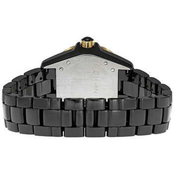 Black ceramic case and bracelet. Uni-directional rotating black ceramic with a rose gold rim bezel. Black lacquered dial with luminous rose gold tone hands and diamond hour markers. Minute markers around the outer rim. Dial Type: Analog. Luminescent hands. Date display at the 6 o'clock position. Quartz movement. Scratch resistant sapphire crystal. Screw down crown. Solid case back. Round case shape. Case size: 38 mm. Case thickness: 11 mm. Band width: 19 mm. Hidden fold over clasp. Water resistant at 200 meters / 660 feet. Functions: hours, minutes. J12 Quartz Series. Fashion watch style. Watch label: Swiss Made. Chanel J12 Quartz Black Ceramic Unisex Watch H2544.