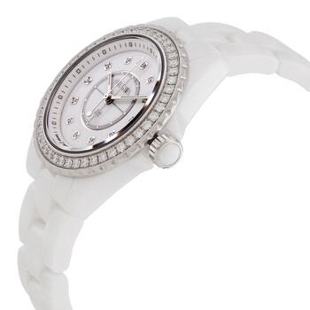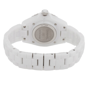 White ceramic case and bracelet. Fixed silver-tone stainless steel with diamonds bezel. White dial with silver-tone hands and diamond hour markers. Dial Type: Analog. Quartz movement. Scratch resistant sapphire crystal. Solid case back. Round case shape, case size: 33 mm, case thickness: 12.94 mm. Hidden folding clasp. Water resistant at 50 meters / 165 feet. Functions: hour, minute, second. J12 Series. Dress watch style. Watch label: Swiss Made. Chanel J12 Quartz Diamond White Dial Ladies Watch h6418.