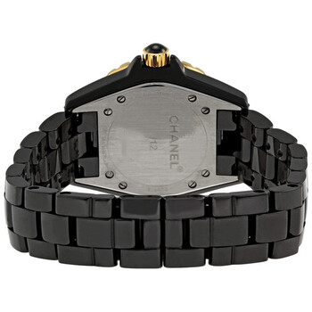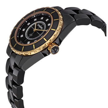 Black ceramic case with a black ceramic bracelet. Uni-directional rotating rose gold bezel with black ceramic fill. Black dial with gold tone with luminous tips hands and diamond hour markers. Minute markers around the outer rim. Dial Type: Analog. Date displays at the 6 o'clock position. Quartz movement. Scratch resistant sapphire crystal. Solid case back. Case size: 33 mm. Case thickness: 11 mm. Round case shape. Band width: 16 mm. Hidden folding clasp. Water resistant at 200 meters / 660 feet. Functions: hours, minutes, date. Fashion watch style. Watch label: Swiss Made. Chanel J12 Quartz Unisex Watch H2543.