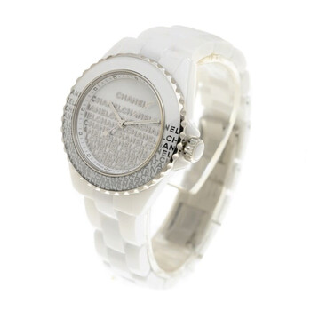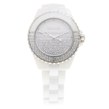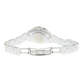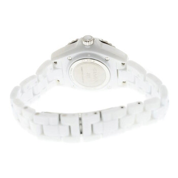 White ceramic case and bracelet. White ceramic bezel. White dial with silver-tone hands and index hour markers. Minute markers around the outer rim. Dial Type: Analog. Luminescent hands and markers. Quartz movement. Scratch resistant sapphire crystal. Solid case back. Round case shape, case size: 33 mm. Fold over clasp with a safety release. Water resistant at 200 meters / 660 feet. Functions: hour, minute, second. J12 Series. Luxury watch style. Watch label: Swiss Made. Chanel J12 Quartz White Dial Ladies Watch H7419.
