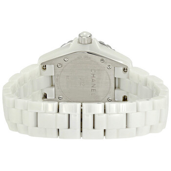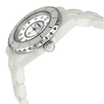 White ceramic case with a white ceramic bracelet. Unidirectional rotating silver-tone bezel with a white ceramic top ring. Mother of pearl dial with luminous silver-tone hands and diamond hour markers. Arabic numerals mark the 3, 6, 9 and 12 o'clock positions, Minute markers around the outer rim. Dial Type: Analog. Luminescent hands and dial markers. Quartz movement. Scratch resistant sapphire crystal. Screw locked crown with a white ceramic cabochon. Solid case back. Case size: 33 mm. Case thickness: 11 mm. Round case shape. Band width: 14 mm. Band length: 7 inches. Hidden fold over clasp. Water resistant at 200 meters / 660 feet. Functions: hour, minute, second. Additional Info: in general, suitable for professional marine activity and serious surface water sports, but not scuba diving. Fashion watch style. Watch label: Swiss Made. Chanel J12 White Ceramic Diamonds Quartz Ladies Watch H2422.