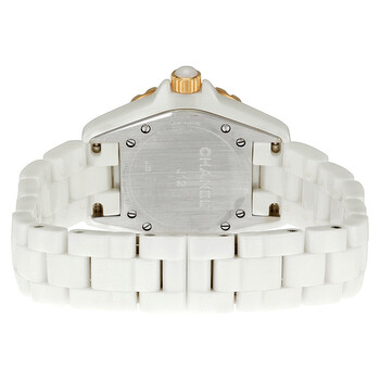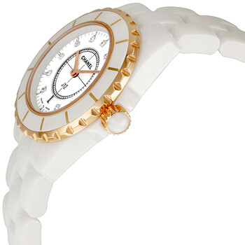 White ceramic case with a white ceramic bracelet. Unidirectional rotating rose gold bezel with a white ceramic inlay.. White dial with rose gold-tone hands and diamond hour markers. Minute markers around the outer rim. Dial Type: Analog. Luminescent hands and dial markers. Date display at 6 o'clock position. Quartz movement. Scratch resistant sapphire crystal. Screw down crown. Solid case back. Case size: 33 mm. Case thickness: 11 mm. Round case shape. Band width: 16 mm. Band length: 7 inches. Deployment clasp. Water resistant at 200 meters / 660 feet. Functions: hours, minutes, seconds, date. Additional Info: suitable for recreational scuba diving. Fashion watch style. Watch label: Swiss Made. Item Variations: CN H2181, CN-H2181, CN/H2181, H2181. Chanel J12 White Ceramic Unisex Watch H2181.
