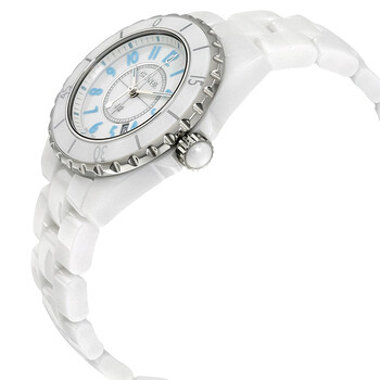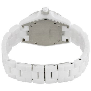 White ceramic case with a white ceramic bracelet. Uni-directional rotating bezel. White dial with silver-tone hands and Arabic numeral hour markers. Minute markers around the outer rim. Dial Type: Analog. Date display between 4 and 5 o'clock position. Quartz movement. Scratch resistant sapphire crystal. Screw down crown. Case diameter: 33 mm. Round case shape. Hidden deployment clasp. Water resistant at 200 meters / 660 feet. Functions: hour, minute, second. Luxury watch style. Chanel J12 White Dial Ceramic Ladies Watch H3826.