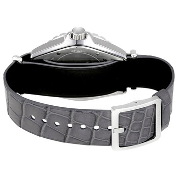 Titanium case with a grey alligator leather strap. Uni-directional rotating titanium bezel with a ceramic top ring. Grey dial with silver-tone hands and Arabic numeral hour markers. Minute markers around the outer rim. Dial Type: Analog. Luminescent hands. Date display between 4 and 5 o'clock position. Automatic movement with a 42-hour power reserve. Screw down crown. Solid case back. Case size: 38 mm. Round case shape. Buckle clasp. Water resistant at 200 meters / 660 feet. Functions: date, hour, minute, second. Luxury watch style. Watch label: Swiss Made. Chanel J12-G10 Automatic Men's Watch H4187.