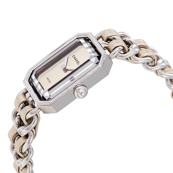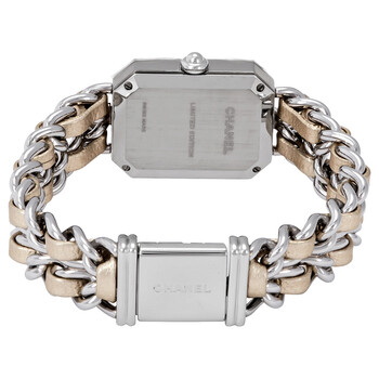 Stainless steel case with a stainless steel with interwoven golden fabric strap. Fixed bezel. Mirror dial with silver-tone hands. Dial Type: Analog. Quartz movement. Solid case back. Rectangle case shape, case size: 26.1 x 20 mm, case thickness: 7 mm. Water resistant at 30 meters / 100 feet. Functions: hour, minute. Luxury watch style. Watch label: Swiss Made. Chanel Premiere Rock Mirror Dial Ladies Watch H5584.