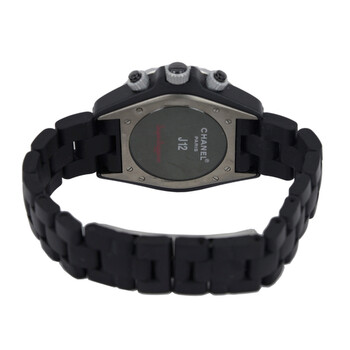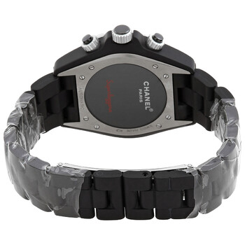 Black ceramic case with a black rubber strap. Uni-directional rotating stainless steel bezel with an inlaid black ceramic ring showing tachymeter markings. Silver dial with luminous black hands and Arabic numeral hour markers. Minute markers around the outer rim. Dial Type: Analog. Luminescent hands and markers. Date display between the 4 and 5 o'clock positions. Chronograph - three sub-dials displaying: 60 second, 30 minute and 12 hour. Automatic movement. Scratch resistant sapphire crystal. Screw down crown. Solid case back. Round case shape. Case size: 41 mm. Case thickness: 14 mm. Hidden fold over clasp. Water resistant at 200 meters / 660 feet. Functions: hours, minutes, seconds, calendar, chronograph, tachymeter. J12 Series. Sport watch style. Watch label: Swiss Made. Chanel Superleggera Black Ceramic Chronograph Men's Watch H2039.