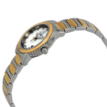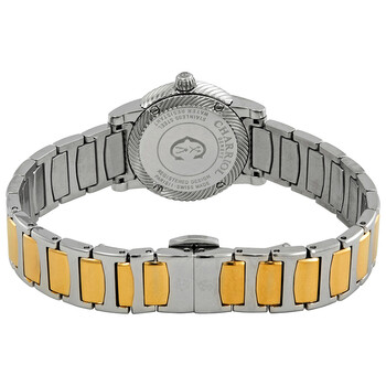 Silver-tone stainless steel case with a two tone (gold-tone/silver-tone) stainless steel bracelet. Fixed gold-tone stainless steel bezel. Mother of pearl dial with silver-tone hands and diamond hour markers. Dial Type: Analog. Date display between 4 and 5 o'clock position. Quartz movement. Round case shape. Case size: 26 mm. Functions: date, hour, minute, second. Additional Info: set of 12 diamonds on dial (.06 cts). Dress watch style. Watch label: Swiss Made. Charriol Parisii Diamond Mother of Pearl Dial Two-Tone Ladies Watch P26SY2.911.001.