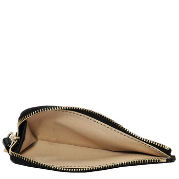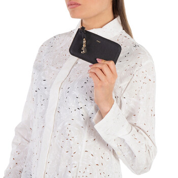 Chloe Ladies Card Case. SKU: CHC21WP944F57001. Color: Black. Size: 5 1/2"W x 3 1/2"H x 1/4"D. Chloe Alphabet Leather Card Case. This Alphabet Card Case is Crafted from textured pebbled leather and includes a knotted leather strap, zip-top closure, rear slip pocket, multiple card slots and is adorned with an alphabet charm. 100% Leather.