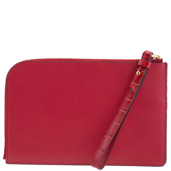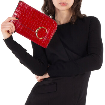 Chloe Ladies Pouch. SKU: CHC19UP086A87634. Color: Dusky Red. Size: 9"W x 6"H x 0.5"D. Chloe C Croc Embossed Leather Pouch. This pouch features croc-embossed calfskin leather with a canvas fabric lining, polished gold-tone hardware, a wristlet strap, a zip-around top closure, an interior divider, and a metal C logo detail on the front. 100% Calfskin.