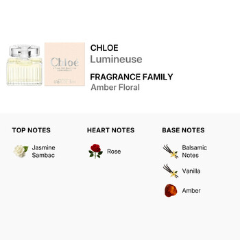 Chloe Lumineuse opens with the captivating aroma of Jasmine sambac, which seamlessly blends into the romantic heart notes of Rose. The fragrance journey concludes with a warm base of Balsamic notes, Vanilla, and Amber, creating an irresistible and lasting impression.