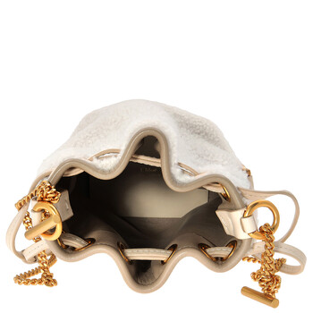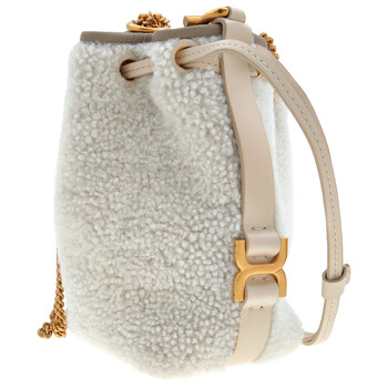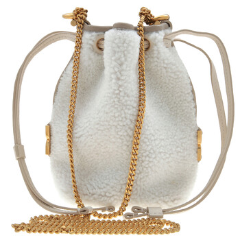Chloe Ladies Bucket Bag. SKU: CHC23WP844L609. Barcode: 7614027148510. Color: Beige. Size: H7" x W5.5" x D3.5". Chloe Marcie Micro Bucket Bag. This Marcie Micro Bucket Bag is crafted from shearling and features a detachable curb chain shoulder strap, logo hardware at the sides, a drawstring closure, and a buffed lambskin lining.