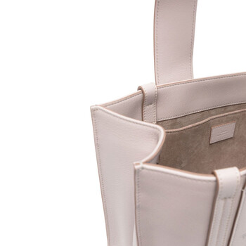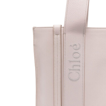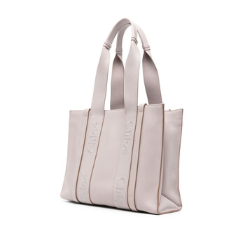 Chloe Ladies Tote. SKU: CHC24SS383M40084. Material: Calfskin. Color: Grey. Size: W:37cm x H:26cm x D:12cm. Chloe Medium Woody Leather Tote Bag. This tote is crafted from calf leather with a pebbled texture, featuring an open top, two top handles, and a signature Woody ribbon. It includes a spacious main compartment, an internal slip pocket, an internal logo patch, and a full lining. Lining: 100% Calf Leather, Outer: 100% Bullhide Leather.
