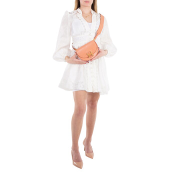 Chloe Ladies Crossbody. SKU: CHC23AP847K826T5. Material: Calfskin;Lambskin. Closure Type: Snap. Color: Pink. Size: W: 7.5" x H: 5.1".. Chloe Mini Marcie Flap Soft Leather Bag Crossbody Bag. This mini flap bag is made from smooth calfskin, with a luxurious lambskin lining. It offers versatile carrying options with a long shoulder strap and cross-body style. The bag features a snap button closure, one main compartment, and an internal flat pocket. Additionally, it includes a removable strap for added convenience. 100% Calfskin, 100% Lambskin.