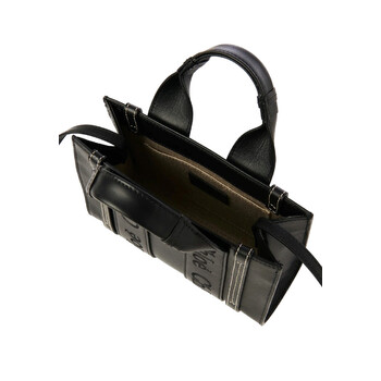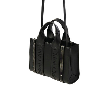Chloe Ladies Tote. Woody series. SKU: CHC23SP237I60001. Color: Black. Size: W: 7.9" x H: 5.5" x D: 1.6". Chloe Mini Woody Leather Tote Bag. This tote bag is made from luxurious smooth calfskin, accented with shiny calfskin strips and a linen lining. Its sleek, modern design is enhanced by vertical leather strips and the brand's signature logo ribbon. The bag features a main compartment that fits a mobile phone and offers versatile carrying options: by hand, on the shoulder, or cross-body. 100% Calfskin.