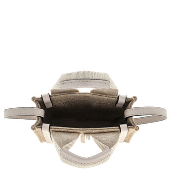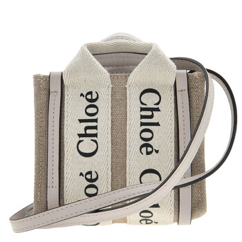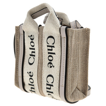 Chloe Ladies Tote. Woody series. SKU: CHC22AP235I2600O. Color: Muskgr. Size: W: 4.7" x H: 5.5" x D: 1.6". Chloe Nano Woody Linen Canvas Tote. This nano tote bag is made from linen canvas with shiny calfskin strips. It has one strap and one top handle, It captures the essence of the iconic Woody line in a compact silhouette with a single main compartment.contrasting vertical leather trims and the brand's signature logo ribbon, inspired by the Maison's Woody mule. The bag can be carried on the shoulder, cross-body, or by hand. 100% Linen, 100% Calfskin.