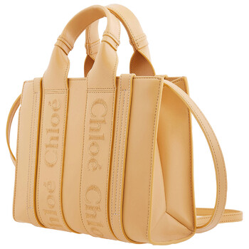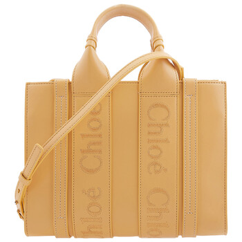 Chloe Ladies Tote. SKU: CHC23US397I607. Color: Honeyg. Size: 26.5 cm x 20 cm x 8 cm. Chloe Small Woody Logo Tote Bag. Crafted from smooth grain calf leather, this Woody bag features a main compartment, detachable shoulder strap, circular top handles and finished with an embroidered logo to the front. Calf Leather 100%. Made in Italy.