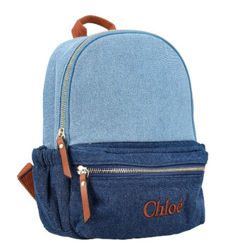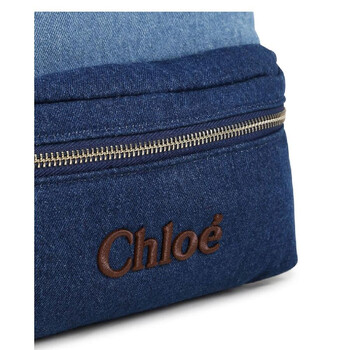 Chloe Ladies Backpack. SKU: C20280-Z10. Color: Denim Blue. Size: W: 27cm x H: 22cm x D: 8.5cm. Chloe Two Tone Logo Embroidered Cotton Backpack. Organic cotton backpack with leather trim, featuring an embroidered logo. It has a single top handle and two padded, adjustable shoulder straps. The backpack includes an all-around zip fastening and a front zip-fastening pocket. Outer: Cotton 100%, Bovine Leather (top grain) 100%; Lining: Cotton 100%.