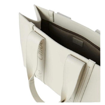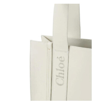 Chloe Ladies Tote. SKU: CHC22WS383I60101. Color: White. Size: W: 14.6" x H: 10.2" x D: 4.7". Chloe Woody Leather Logo Tote Bag. This Woody Tote Bag is made from smooth calfskin, offering a luxurious and natural look. It features a spacious main compartment with a practical flat pocket. The bag's modern design is highlighted by vertical leather strips and the signature brand's logo, which is revisited in tonal embroidery on calfskin. It can be comfortably carried on the shoulder. 100% Calfskin, 100% Linen. Made in Italy.