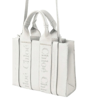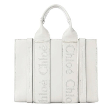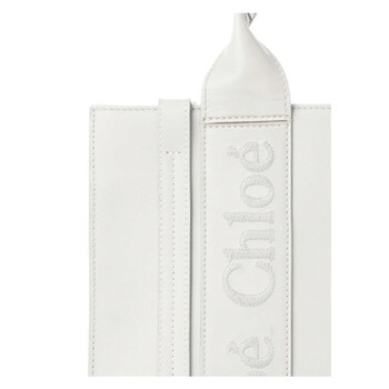 Chloe Ladies Tote. SKU: CHC22WS397I60101. Material: Calfskin;Linen. Color: White. Size: W: 10.4" x H: 7.9" x D: 3.1". Chloe Woody Leather Small Tote Bag. Tote bag crafted from smooth calfskin, featuring an embroidered logo. Carry options include shoulder, arm, or cross-body with two short handles and a removable, adjustable long strap. The bag offers one spacious main compartment and an internal flat pocket for added organization. 100% calfskin, 100% Linen.
