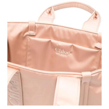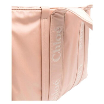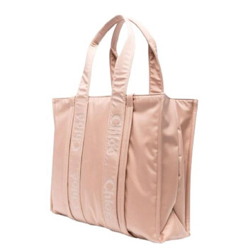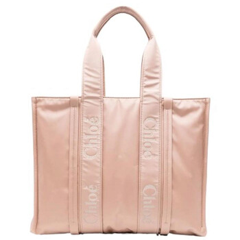 Chloe Ladies Tote. SKU: CHC23WS382L416K7. Closure Type: Open. Color: Pink. Size: W: 42cm x H: 31.5cm x D: 13.5cm. Chloe Woody Logo Large Tote. The tote features tonal stitching and full lining. It has an embroidered logo on both the front and rear. The padded design includes an open top and two rolled top handles. Inside, there is a main compartment and an internal patch pocket. 40% Polyurethane, 30% Polyamide, 30% Polyester. Made in Italy.