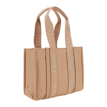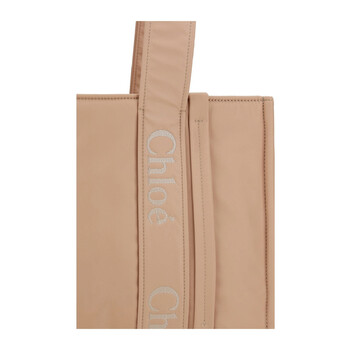Chloe Ladies Tote. Woody series. SKU: CHC23WS383L416K7. Barcode: 7614027171624. Color: Rosedu. Size: 37 x 26 x 12 cm Strap: 61 cm. Chloe Woody Logo Medium Tote Bag. Rose dust nylon tote bag featuring dual top handles with matching logo tape, an internal flat pocket, and a fabric-lined interior. 40% polyurethane, 30% polyamide, 30% polyester.
