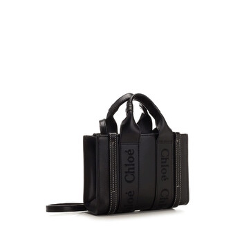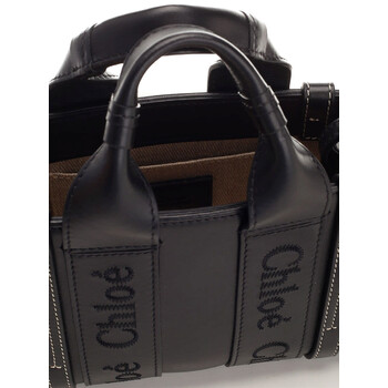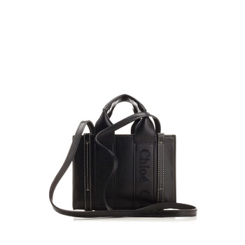 Chloe Ladies Tote. Woody series. SKU: CHC23UP237I60001. Color: Black. Size: W: 20 x H: 14 x D: 7 cm. Chloe Woody Logo Mini Tote Bag. Chloe's mini 'Woody' tote bag in black leather features a detachable shoulder strap, a linen-lined interior, and a convenient side pocket.