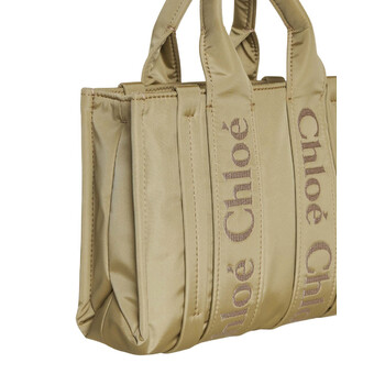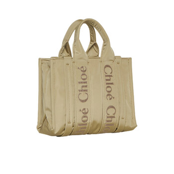 Chloe Ladies Tote. Woody series. SKU: CHC23WS397L4124P. Color: Hotsan. Size: 26 x 21 x 7 cm. Chloe Woody Logo Small Nylon Tote Bag. A nylon tote bag with two top handles featuring tone-on-tone logo tape, a detachable shoulder strap, decorative tone-on-tone stripes, an internal flat pocket, and fabric lining. 40% polyurethane 30% polyamide 30% polyester. Made in Italy.