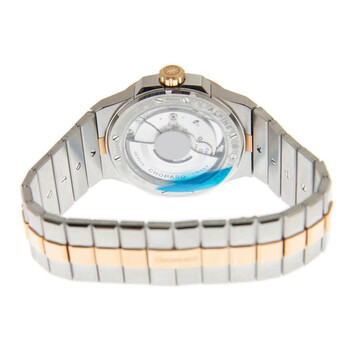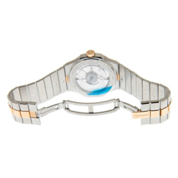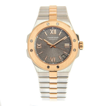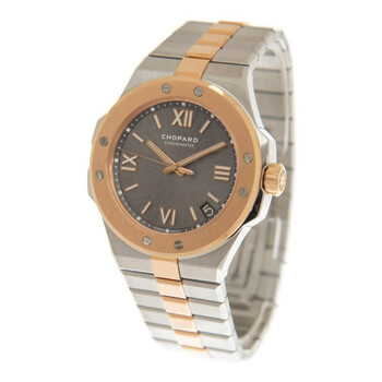 Silver-tone stainless steel case with a two-tone (silver-tone and rose gold-tone) 18kt rose gold and stainless steel bracelet. Fixed rose gold-tone 18kt rose gold bezel. Grey dial with rose gold-tone hands and Roman numeral hour markers. Minute markers around the outer rim. Dial Type: Analog. Luminescent hands and markers. Date display between 4 and 5 o'clock position. Chopard Calibre 01.01-C Automatic movement, containing 40 Jewels, composed of 207 parts, bitting at 28800 vph, and has a power reserve of approximately 60 hours. Scratch resistant sapphire crystal. Screw down crown. Transparent see through case back. Round case shape, case size: 41 mm. Hidden clasp. Water resistant at 100 meters / 330 feet. Functions: date, hour, minute, second, chronometer. Additional Info: original box, international warranty card, manual (complete accessories). Alpine Eagle Series. Luxury watch style. Watch label: Swiss Made. Chopard Alpine Eagle Automatic Chronometer Grey Dial Men's Watch 298600 6001.