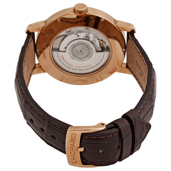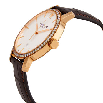18kt rose gold case with a brown (alligator) leather strap. Fixed 18kt rose gold bezel set with diamonds. White dial with rose gold-tone hands and index hour markers. Dial Type: Analog. Date display above the 6 o'clock position. Automatic movement. Scratch resistant sapphire crystal. Pull / push crown. Transparent see through case back. Round case shape. Case size: 40 mm. Tang clasp. Water resistant at 30 meters / 100 feet. Functions: date, hour, minute, second. Classic Series. Luxury watch style. Watch label: Swiss Made. Chopard Classic Automatic Diamond White Dial Men's Watch 171278-0002.