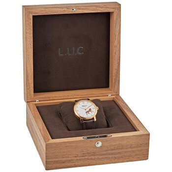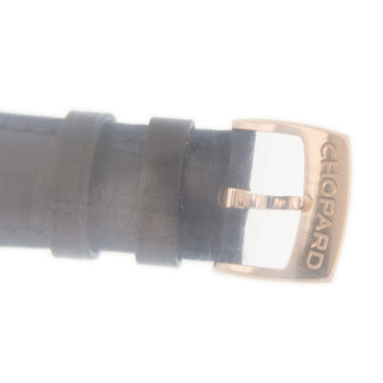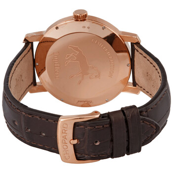 18kt rose gold case with a brown (alligator) leather strap. Fixed 18kt rose gold bezel. White dial with rose gold-tone hands and index hour markers. Roman numerals appear at the 3, 6, 9 and 12 o'clock positions. Dial Type: Analog. Date display above the 6 o'clock position. Automatic movement with a 42-hour power reserve. Scratch resistant sapphire crystal. Pull / push crown. Solid case back. Round case shape. Case size: 40 mm. Case thickness: 8.06 mm. Band width: 20 mm. Tang clasp. Water resistant at 30 meters / 100 feet. Functions: date, day, hour, minute, second. Additional Info: original box, manual (complete accessories). Classic Series. Luxury watch style. Watch label: Swiss Made. Chopard Classic Automatic White Dial Men's Watch 161278 5015.