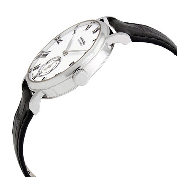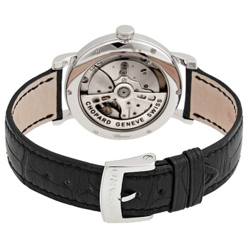 18kt white gold case with a black (alligator) leather strap. Fixed 18kt white gold bezel. White dial with silver-tone leaf-style hands and Roman numeral hour markers. Dial Type: Analog. Date display at the 3 o'clock position. Small seconds sub-dial. Chopard calibre 01.04-C automatic movement, containing 27 Jewels, bitting at 28800 vph, and has a power reserve of approximately 60 hours. Scratch resistant sapphire crystal. Pull / push crown. Transparent case back. Round case shape. Case size: 38 mm. Case thickness: 9.66 mm. Band width: 19 mm. Tang clasp. Water resistant at 30 meters / 100 feet. Functions: date, hour, minute, second. Classic Series. Luxury watch style. Watch label: Swiss Made. Chopard Classic Manufacture Automatic White Dial 18kt White Gold Men's Watch 161289-1001.