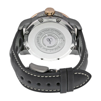 Grey titanium case with a black (barenia calfskin) leather strap. Fixed rose gold with black aluminium ring bezel. Grey dial with luminous rose gold hands and index / small Arabic numeral hour markers. Arabic numerals mark the 6 and 12 o'clock positions. Minute markers around the outer rim. Dial Type: Analog. Luminescent hands and markers. Date display at the 3 o'clock position. ETA Caliber A07.111 Automatic movement, based upon ETA 7750, containing 24 Jewels, bitting at 28800 vph, and has a power reserve of approximately 48 hours. Scratch resistant sapphire crystal. Screw down crown. Solid case back. Round case shape, case size: 44.5 mm, case thickness: 13.9 mm. Band width: 20 mm. Fold over clasp. Water resistant at 100 meters / 330 feet. Functions: date, hour, minute, second, chronometer. Grand Prix De Monaco Historique Series. Luxury watch style. Watch label: Swiss Made. Item Variations: 168568 9001, 168568.9001, 1685689001. Chopard G.P.M.H Grey Dial Black Leather Men's Watch 168568-9001.