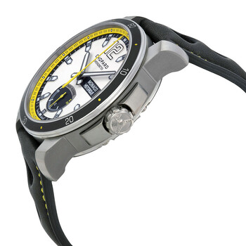 Titanium case with a perforated black (calfskin barenia) leather strap. Fixed titanium bezel with a black aluminium inlay. Snailed grey dial with luminous grey-tone hands and index / small Arabic numeral hour markers. An Arabic numeral appears at the 12 o'clock position. Minute markers around the outer rim. Dial Type: Analog. Luminescent hands and markers. Date display at the 3 o'clock position. Power reserve indicator. ETA-Valgranges caliber A07.211 automatic movement with a 46-hour power reserve. Scratch resistant sapphire crystal. Screw down crown. Solid stainless steel case back. Round case shape. Case size: 44.50 mm. Case thickness: 13.90 mm. Band width: 22 mm. Band length: 8 inches. Tang clasp. Water resistant at 100 meters / 330 feet. Functions: date, hour, minute, second, power reserve indicator, chronometer. Luxury watch style. Watch label: Swiss Made. Item Variations: 168569 3001, 168569.3001, 1685693001. Chopard G.P.M.H. Power Control Titanium And Steel Men's Watch 168569-3001.