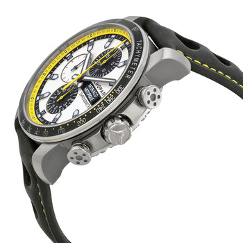 Grey titanium case with a black leather strap. Fixed grey titanium bezel with an inlaid black aluminium ring showing tachymter markings. Silver and yellow dial with luminous hands and index hour markers. Arabic numeral minute markers (at 5 minute intervals). Minute markers around the outer rim. Dial Type: Analog. Luminescent hands and markers. Date display at the 3 o'clock position. Chronograph - three sub-dials displaying: 60 second, 30 minute and 12 hour. ETA-Valgranges caliber A07.211 automatic movement, based upon ETA 7750, containing 25 Jewels, bitting at 28800 vph, and has a power reserve of approximately 46 hours. Scratch resistant sapphire crystal. Screw down crown. Solid case back. Round case shape. Case size: 44.5 mm. Case thickness: 13.9 mm. Band width: 20.3 mm. Band length: 8 inches. Tang clasp. Water resistant at 100 meters / 330 feet. Functions: chronograph, date, hour, minute, second, chronometer. Grand Prix De Monaco Series. Luxury watch style. Watch label: Swiss Made. Item Variations: 168570 3001, 168570.3001, 1685703001. Chopard Grand Prix de Monaco Chronograph Automatic Men's Watch 168570-3001.
