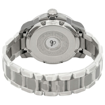 Grey titanium case with a grey titanium bracelet. Fixed grey titanium bezel with an inlaid black aluminium ring. Silver dial with luminous black hands and index / small Arabic numeral hour markers. An Arabic numeral appears at the 12 o'clock position. Minute markers around the outer rim. Dial Type: Analog. Luminescent hands and markers. Date display at the 3 o'clock position. Power reserve indicator. Automatic movement. Scratch resistant sapphire crystal. Screw down crown. Solid case back. Round case shape. Case size: 44.5 mm. Case thickness: 13.9 mm. Band width: 22 mm. Fold over clasp with a safety release. Water resistant at 100 meters / 330 feet. Functions: date, hour, minute, second, power reserve indicator, chronometer. Grand Prix De Monaco Historique Series. Luxury watch style. Watch label: Swiss Made. Chopard Grand Prix De Monaco Historique Automatic Chronometer Silver Dial Men's Watch 158569-3002.