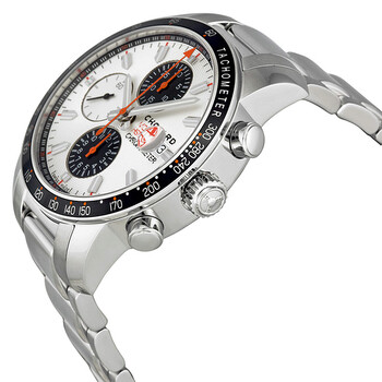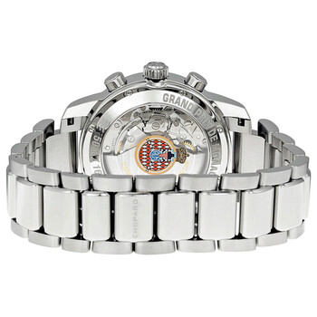 Stainless steel case with a silver-tone stainless steel bracelet. Fixed tachymeter scale black PVD stainless steel bezel. Silver dial with luminous hands and index hour markers. Minute markers around the outer rim. Dial Type: Analog. Date display at the 3 o'clock position. Chronograph - three sub-dials displaying: 60 second, 30 minute and 12 hour. Frederic Piguet Caliber 1185 Automatic movement, containing 37 Jewels, composed of 304 parts, bitting at 21600 vph, and has a power reserve of approximately 48 hours. Scratch resistant sapphire crystal. Pull / push crown. Skeleton case back. Round case shape, case size: 42.5 mm, case thickness: 14 mm. Band width: 20 mm, band length: 8 inches. Deployment clasp. Water resistant at 50 meters / 165 feet. Functions: chronograph, date, hour, minute, second, chronometer. Grand Prix De Monaco Historique 2010 Series. Luxury watch style. Watch label: Swiss Made. Chopard Grand Prix de Monaco Silver Dial Chronograph Men's Watch 158.