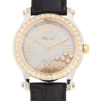 18kt gold case with a black alligator leather strap. Fixed gold-tone diamond set bezel. White dial with Roman numeral hour markers. Dial Type: Analog. Automatic movement. Scratch resistant sapphire crystal. Screw down crown. Transparent case back. Round case shape. Case size: 36 mm. Tang clasp. Functions: hour, minute. Additional Info: original box, international warranty card, manual (complete accessories). Luxury watch style. Watch label: Swiss Made. Chopard HAPPY DIAMONDS White Dial Unisex Watch 278578 4001.