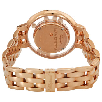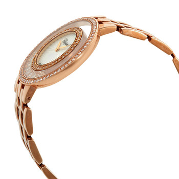 18kt rose gold case and bracelet. Fixed 18kt rose gold double bezel set with diamonds and features seven floating diamonds. Mother of pearl dial with rose gold-tone hands. No markers. Dial Type: Analog. Quartz movement. Scratch resistant sapphire crystal. Pull / push crown. Solid case back. Round case shape, case size: 37 mm. Fold over clasp. Water resistant at 30 meters / 100 feet. Functions: hour, minute. Additional Info: 106 diamonds = 0.68 ct. Happy Diamonds Icons Series. Luxury watch style. Watch label: Swiss Made. Item Variations: 209428 5201, 209428.5201, 2094285201. Chopard Happy Diamonds Icons Quartz Mother of Pearl Dial Ladies Watch 209428-5201.