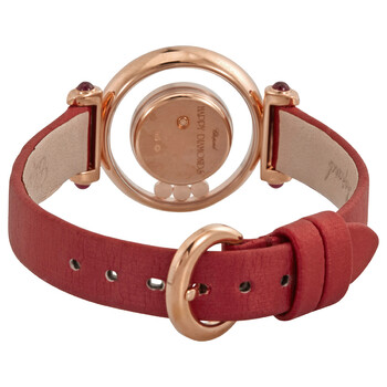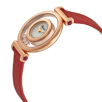 18kt rose gold case with a red fabric strap. Fixed 18kt rose gold double bezel with 3 rolling diamonds. Mother of pearl dial with rose gold-tone hands. No markers. Dial Type: Analog. Quartz movement. Scratch resistant sapphire crystal. Pull / push crown. Solid case back. Round case shape. Case size: 25.8 mm. Tang clasp. Water resistant at 30 meters / 100 feet. Functions: hour, minute. Happy Diamonds Series. Dress watch style. Watch label: Swiss Made. Chopard Happy Diamonds Quartz Mother of Pearl Dial Ladies Watch 204780-5201.