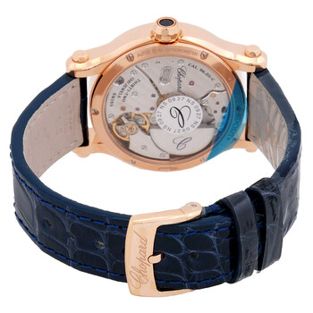 Rose gold-tone 18kt rose gold case with a blue alligator leather strap. Fixed rose gold-tone bezel with diamond set. Blue dial with rose gold-tone hands and diamond hour markers. Dial Type: Analog. Automatic movement with a 65-hour power reserve. Scratch resistant sapphire crystal. Transparent see through case back. Round case shape, case size: 36 mm, case thickness: 12.29 mm. Tang clasp. Functions: hour, minute. Additional Info: limited edition of 250 pieces. Happy Moon Series. Luxury watch style. Watch label: Swiss Made. Chopard Happy Moon Automatic Diamond Blue Dial Watch 274894-5001.