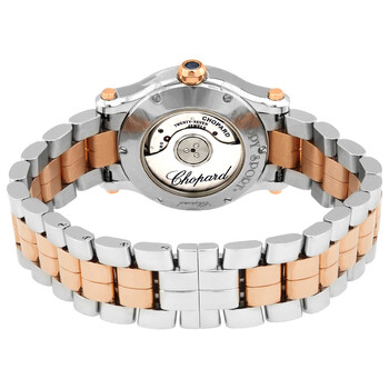 Stainless steel case with a stainless steel bracelet with 18kt rose gold center links. Fixed 18kt rose gold bezel. Mother of pearl dial (with 5 floating diamonds) with rose gold hands and index hour markers. Roman numerals appear at the 3, 6, 9 and 12 o'clock position. Minute markers around the outer rim. Dial Type: Analog. Chopard calibre 09.01-C automatic movement, containing 27 Jewels, bitting at 25200 vph, and has a power reserve of approximately 42 hours. Scratch resistant sapphire crystal. Transparent case back. Round case shape. Case size: 30 mm. Fold over clasp. Water resistant at 30 meters / 100 feet. Functions: hour, minute, second, chronometer. Happy Sport Series. Luxury watch style. Watch label: Swiss Made. Chopard Happy Sport Automatic 18kt Rose Gold Stainless Steel Diamonds Ladies Watch 278573-6019.