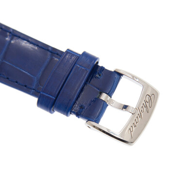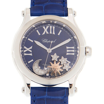 Silver-tone stainless steel case with a blue alligator leather strap. Fixed silver-tone stainless steel bezel. Blue dial with silver-tone sword-shaped hands and Roman numeral hour markers. Minute markers around the outer rim. Dial Type: Analog. Date display at the o'clock position. Automatic movement. Scratch resistant sapphire crystal. Transparent case back. Round case shape, case size: 36 mm. Buckle clasp. Water resistant at 30 meters / 100 feet. Functions: hour, minute, second. Additional Info: original box, international warranty card, manual (complete accessories). Happy sport series. Luxury watch style. Watch label: Swiss Made. Chopard Happy Sport Automatic Blue Dial Watch 278559 3011.