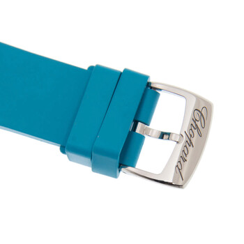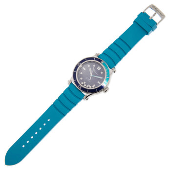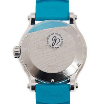 Silver-tone stainless steel case with a blue rubber strap. Blue bezel. Blue dial with silver-tone hands and index hour markers. Minute markers around the outer rim. Dial Type: Analog. Luminescent hands and markers. Date display between 4 and 5 o'clock position. 5 floating diamonds subdials. Chopard Calibre 01.01-C Automatic movement, containing 40 Jewels, composed of 207 parts, bitting at 28800 vph, and has a power reserve of approximately 60 hours. Scratch resistant sapphire crystal. Screw down crown. Solid case back. Round case shape, case size: 40 mm. Buckle clasp. Water resistant at 300 meters. Functions: date, hour, minute, second, chronometer. Additional Info: original box, international warranty card, manual (complete accessories). Happy Sport Series. Luxury watch style. Watch label: Swiss Made. Chopard Happy Sport Automatic Chronometer Blue Dial Ladies Watch 278587-3001.