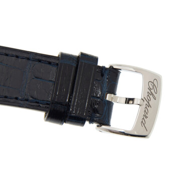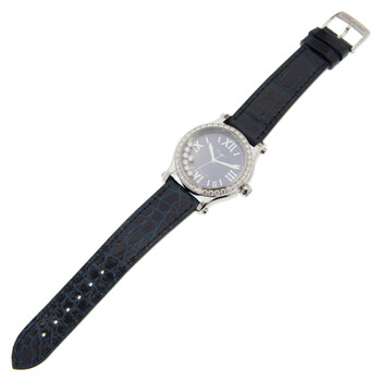 Stainless steel case with a blue (alligator) leather strap. Fixed stainless steel bezel set with diamonds. Blue (with seven floating diamonds) dial with silver-tone hands and index hour markers. Roman numeral appear at the 3, 6, 9 and 12 o'clock positions. Minute markers around the outer rim. Dial Type: Analog. Date display between the 4 and 5 o'clock positions. Sellita caliber SW 300-1 automatic movement with a 42 hour power reserve. Scratch resistant sapphire crystal. Pull / push crown. Transparent case back. Round case shape. Case size: 36 mm. Band width: 18 mm / 16 mm. Fold over clasp with a safety release. Water resistant at 30 meters / 100 feet. Functions: date, hour, minute, second. Happy Sport Series. Luxury watch style. Watch label: Swiss Made. Chopard Happy Sport Automatic Diamond Blue Dial Ladies Watch 278559-3006.