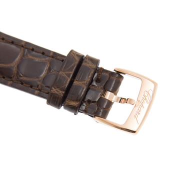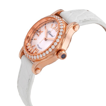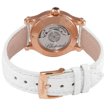 ~ 18kt rose gold case with a white (alligator) leather strap. Fixed 18kt rose gold bezel set with diamonds. Pink dial with five floating diamonds with rose gold-tone sword-shaped hands and index hour markers. Roman numerals mark the 3, 6, 9 and 12 o'clock positions. Minute markers around the outer rim. Dial Type: Analog. Sellita calibre SW 300-1 Automatic movement, based upon Sellita SW 300, containing 25 Jewels, bitting at 28800 vph, and has a power reserve of approximately 38 hours. Scratch resistant sapphire crystal. Pull / push crown. Transparent case back. Round case shape. Case size: 30 mm. Case thickness: 12.2 mm. Band width: 20 mm, band length: 7 inches. Tang clasp. Water resistant at 30 meters / 100 feet. Functions: hour, minute, second. Happy Sport Series. Luxury watch style. Watch label: Swiss Made. Chopard Happy Sport Automatic Diamond Ladies Watch 274893-5010.