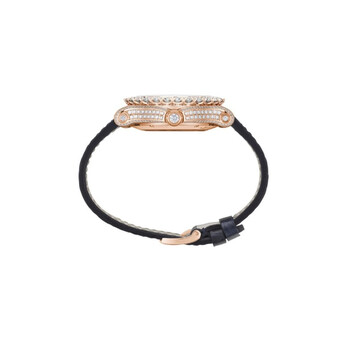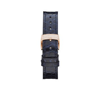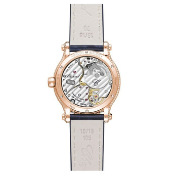 Rose gold-tone diamond set18kt rose gold case with a blue alligator band. Fixed rose gold-tone bezel with diamond set18kt rose gold. Mother of pearl dial with rose gold-tone hands and Roman numeral hour markers. Minute scale around the inner rim. Dial Type: Analog. 7 floating diamonds subdials. Automatic movement. Scratch resistant sapphire crystal. Pull / push crown. Transparent see through case back. Round case shape, case size: 36 mm. Diamond set18kt rose gold buckle clasp. Functions: hour, minute. Happy Sport Series. Luxury watch style. Watch label: Swiss Made. Chopard Happy Sport Automatic Diamond Ladies Watch 274809-5001.