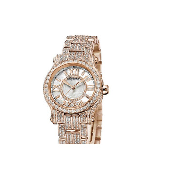 Rose gold-tone diamond set 18kt rose gold case and bracelet. Fixed rose gold-tone bezel with diamond set 18kt rose gold. Mother of pearl dial with rose gold-tone hands and Roman & index hour markers. Minute scale around the inner rim. Dial Type: Analog. 5 floating diamonds subdials. Automatic movement. Scratch resistant sapphire crystal. Pull / push crown. Round case shape, case size: 30 mm. Fold over clasp. Functions: hour, minute, second. Happy Sport Series. Dress watch style. Watch label: Swiss Made. Chopard Happy Sport Automatic Diamond Ladies Watch 274302-5002.