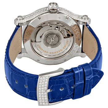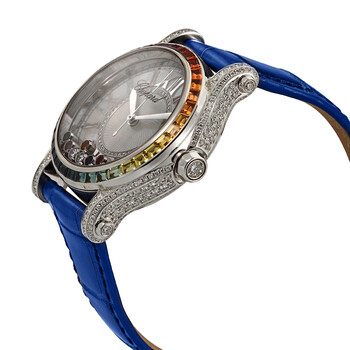 18kt white gold case with a blue (crocodile) leather strap. Fixed 18kt white gold bezel set with multi-colored baguette sapphire crystals. Mother of pearl (diamond-set) dial (with seven floating crystals) with silver-tone hands and index hour markers. Roman numerals mark the 3, 6, 9 and 12 o'clock positions. Minute markers around the outer rim. Dial Type: Analog. Sellita calibre SW 300-1 Automatic movement, based upon Sellita SW 300, containing 25 Jewels, bitting at 28800 vph, and has a power reserve of approximately 38 hours. Scratch resistant sapphire crystal. Pull / push crown. Transparent case back. Round case shape. Case size: 36 mm. Tang clasp. Water resistant at 30 meters / 100 feet. Functions: hour, minute, second. Happy Sport Series. Dress watch style. Watch label: Swiss Made. Chopard Happy Sport Automatic Diamond Mother of Pearl Dial Ladies Watch 274891-1007.